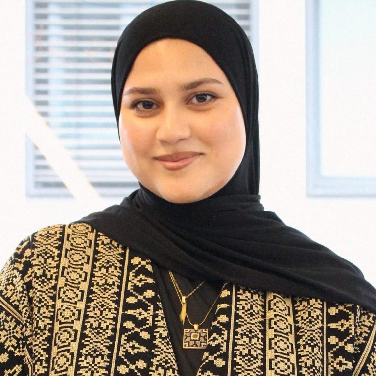 Sarahs Wurzeln liegen in Asqalan, Gaza. Seit 2023 gibt sie durch Tatreez Workshops die Kunst palästinensichen Kreuzstickens weiter und trägt so zum Erhalt ihres kulturellen Erbes bei. Außerdem bietet sie in ihrem online Shop selbstbestickte Stücke an.